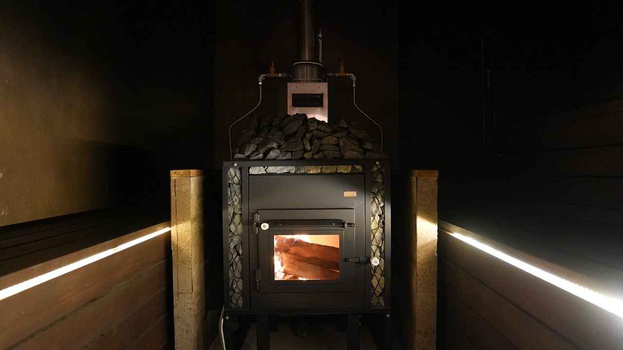 都心ではめずらしい薪ストーブサウナの火のゆらめきを眺め、